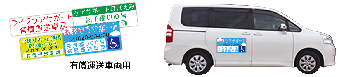 介護タクシーと比べますと事業所名が長い場合が多く感じます。1行で事業所名を記載されたい場合は70センチを超えるものになってしまうことがあります。有償運送車両の文字が6文字と短いので、事業所名を2段に改行することもあります。