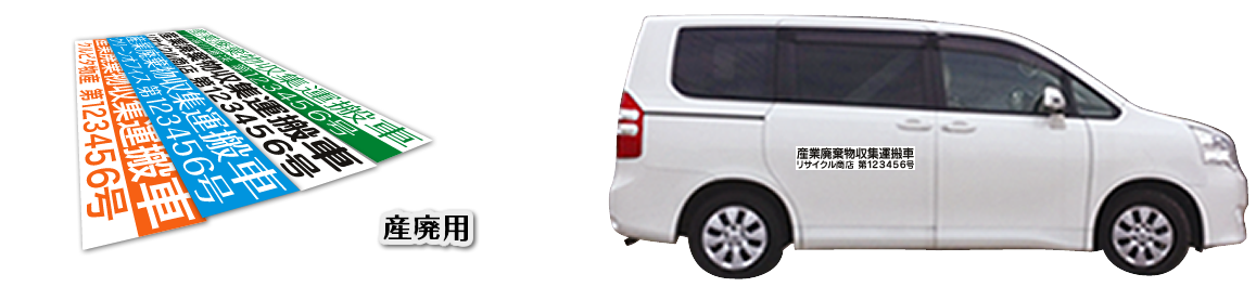 産業廃棄物収集運搬車は5センチ以上の文字、届出名は3センチ以上の文字が規定です。